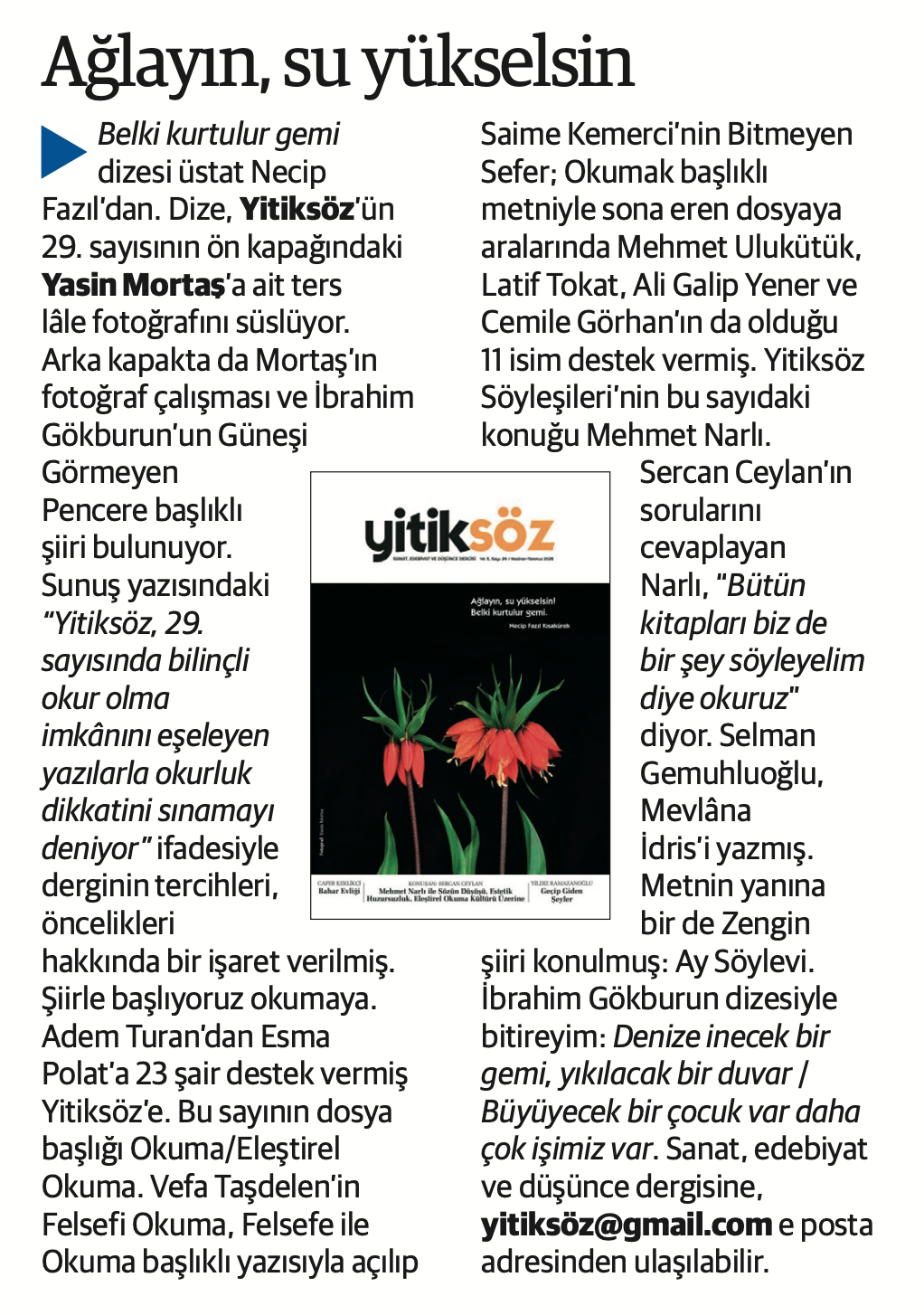 Basında Yitiksöz Yeni Şafak Pazar / Dergilik – Hakkı Yanık Kaynak: Yeni Şafak Pazar ekinin Dergilik köşesinde 13 Temmuz 2025 Pazar günü yayınlanmıştır.